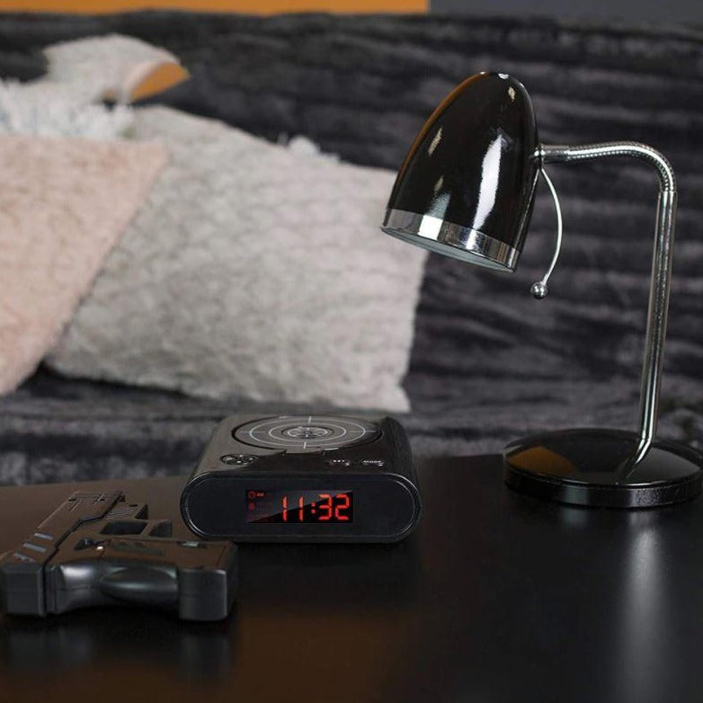 The Sharpshooter Alarm Clock™ doubles as an alarm clock and a shooting game. Simply choose your mode using the buttons on the top of the alarm clock.